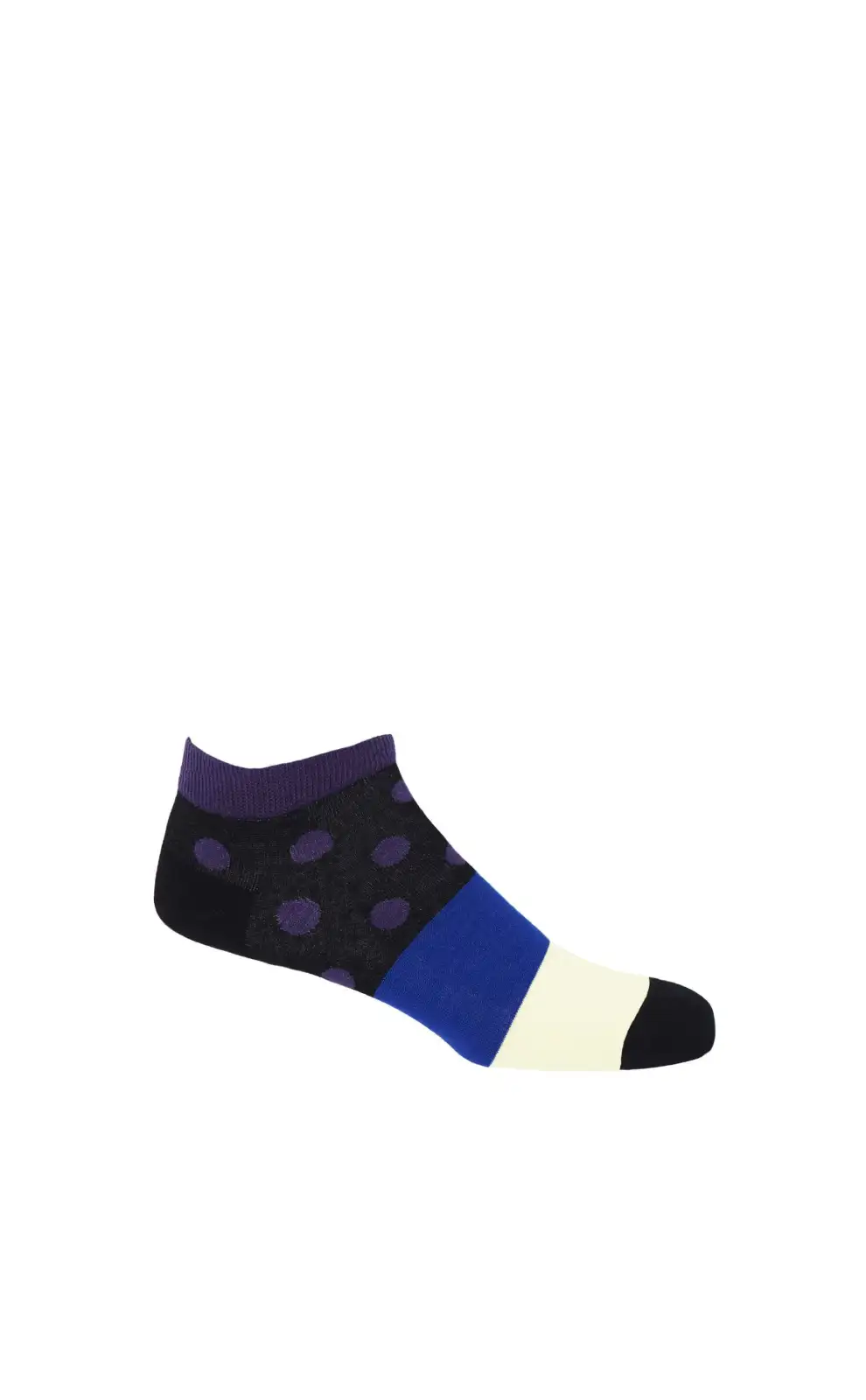 Add a classic yet contemporary look to your summer outfit with the purple Mayfair men's trainer socks. With black, white and blue bands across the foot and vivid royal purple polka dots surrounded by black on the ankle, these Egyptian cotton men's trainer socks are as stylish as they are comfortable.