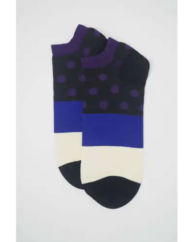 Add a classic yet contemporary look to your summer outfit with the purple Mayfair men's trainer socks. With black, white and blue bands across the foot and vivid royal purple polka dots surrounded by black on the ankle, these Egyptian cotton men's trainer socks are as stylish as they are comfortable.