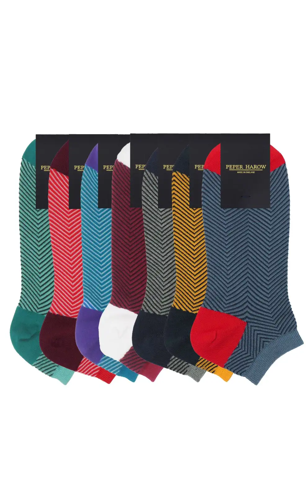 The Luxe men's trainer sock bundle is a true display of relaxed style, featuring an intricate zigzag pattern and varying coloured heels and toes - creating a bold yet elegant contrast. The ever-popular Lux Taylor men's luxury trainer socks comprise this seven-pair bundle in turquoise, red, marine, burgundy, grey, yellow, and blue. Elevate any outfit with these luxury men's socks.