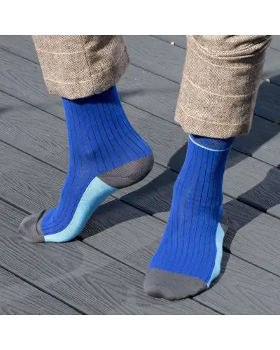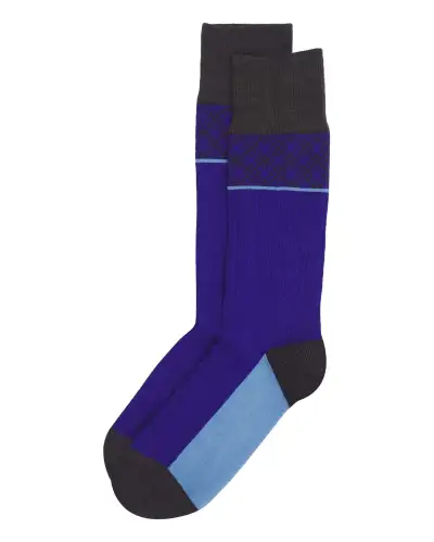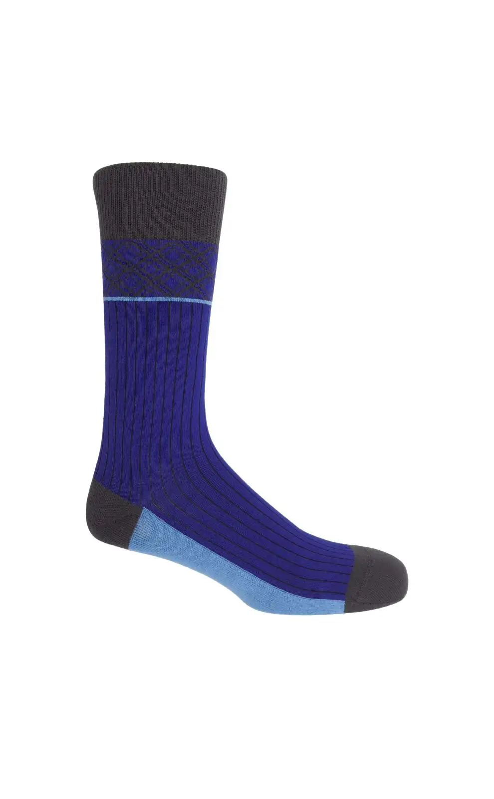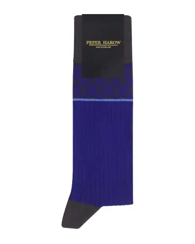 Designed by rising talent Milena Suárez-Silva, the Nexus Men's Luxury Socks in blue embody Peper Harow's refined approach to dapper men's fashion. These limited-edition socks feature sleek black vertical stripes and elegant grey diamond details beneath the cuff, offering a touch of vibrant sophistication. Whether for the office or casual wear, they bring a perfect hint of colour to any ensemble.