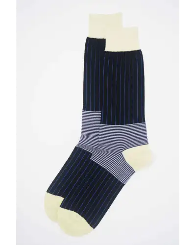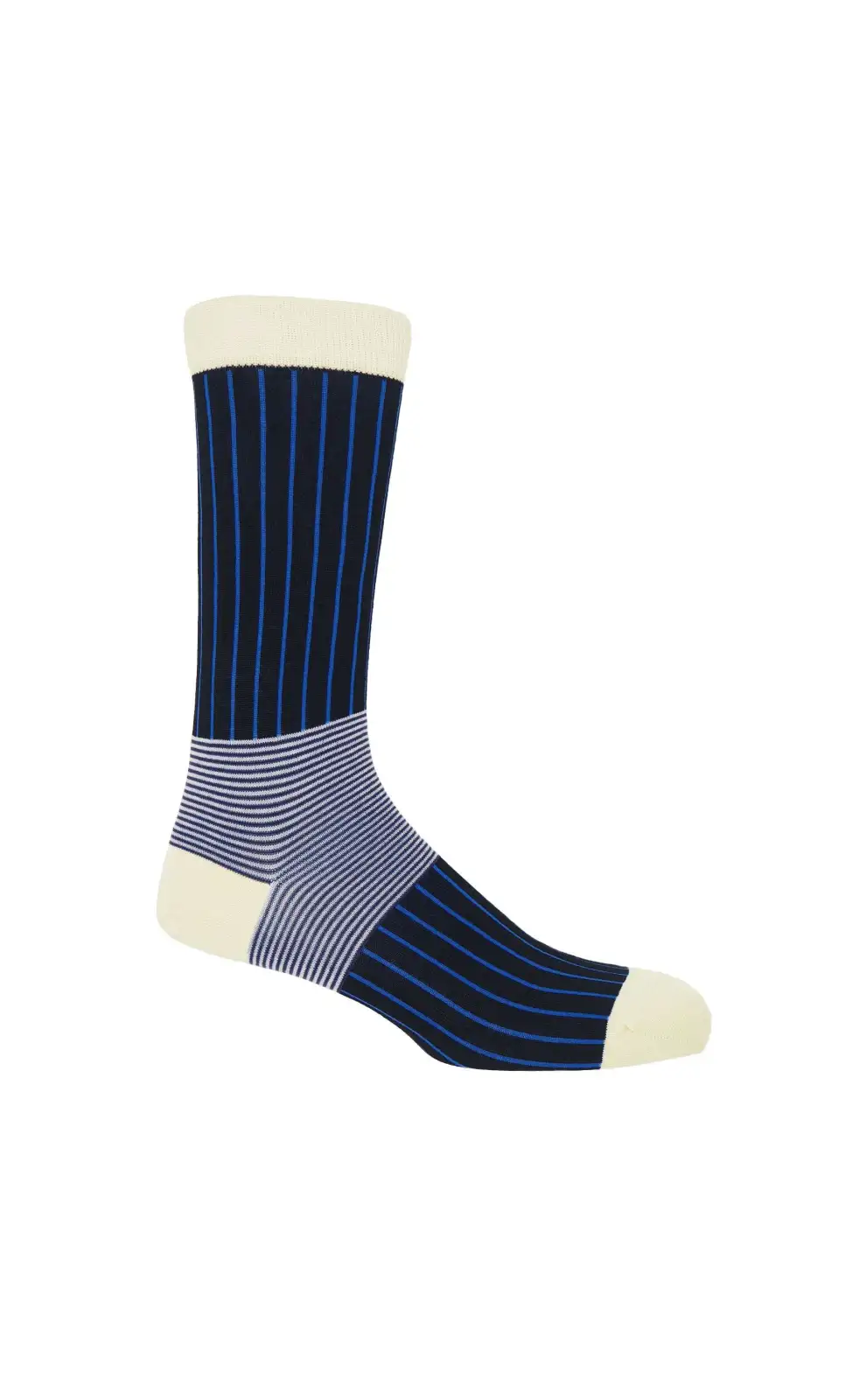 Introducing the black Oxford Stripe luxury men's socks. These resplendent striped men's socks feature a contrasting cream heel and toe and cuff, with contrasting white and purple horizontal stripes. Combined with the vertical vivid blue stripes these dazzling cotton socks embody the quirkiness that is Peper Harow.