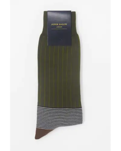 Introducing the sage Oxford Stripe luxury men's socks. These sumptuous striped men's socks feature a complementing brown heel and toe, with contrasting white and black horizontal stripes. Combined with the vertical green stripes these dazzling cotton socks embody the quirkiness that is Peper Harow.