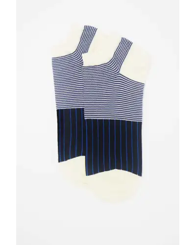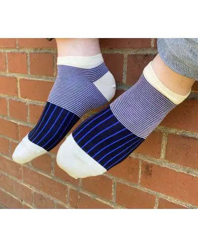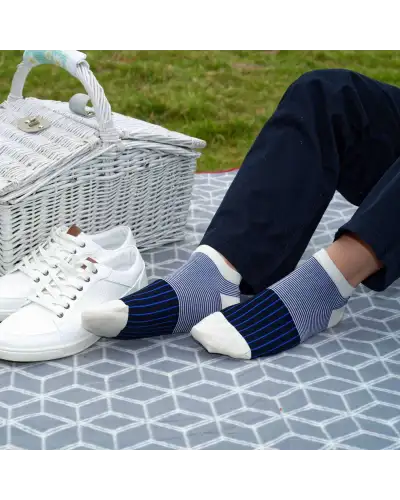 Adding style to your every-day outfit has got a whole lot easier with the magnificent black Oxford Stripe men's trainer socks. With its cream heel and toe, and deep blue vertical stripes intersecting with horizontal navy and cream stripes, these luxurious black Egyptian cotton trainer socks for men embody the quirkiness and style that is Peper Harow.