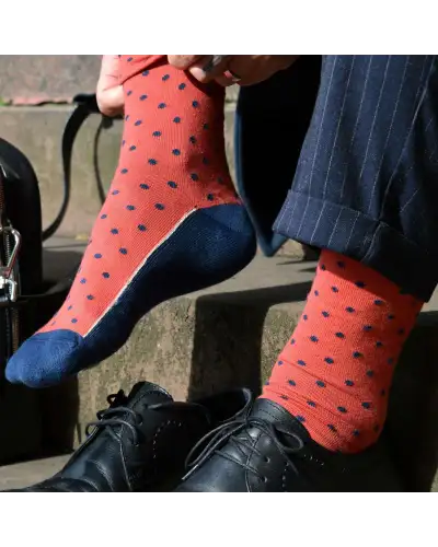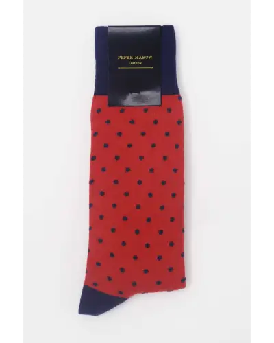 Add a spot of colour with our apple Pin Polka men's luxury socks. With its lively dots and contrasting cuff, heel and toe, the Pin Polka collection is a Peper Harow best seller and a must have for any sock drawer. A perfect complement to everyday attire.
