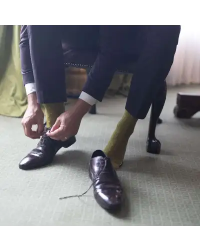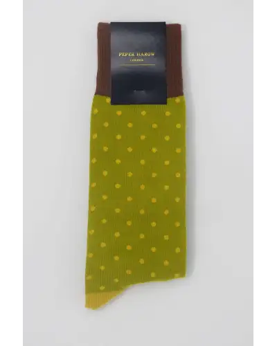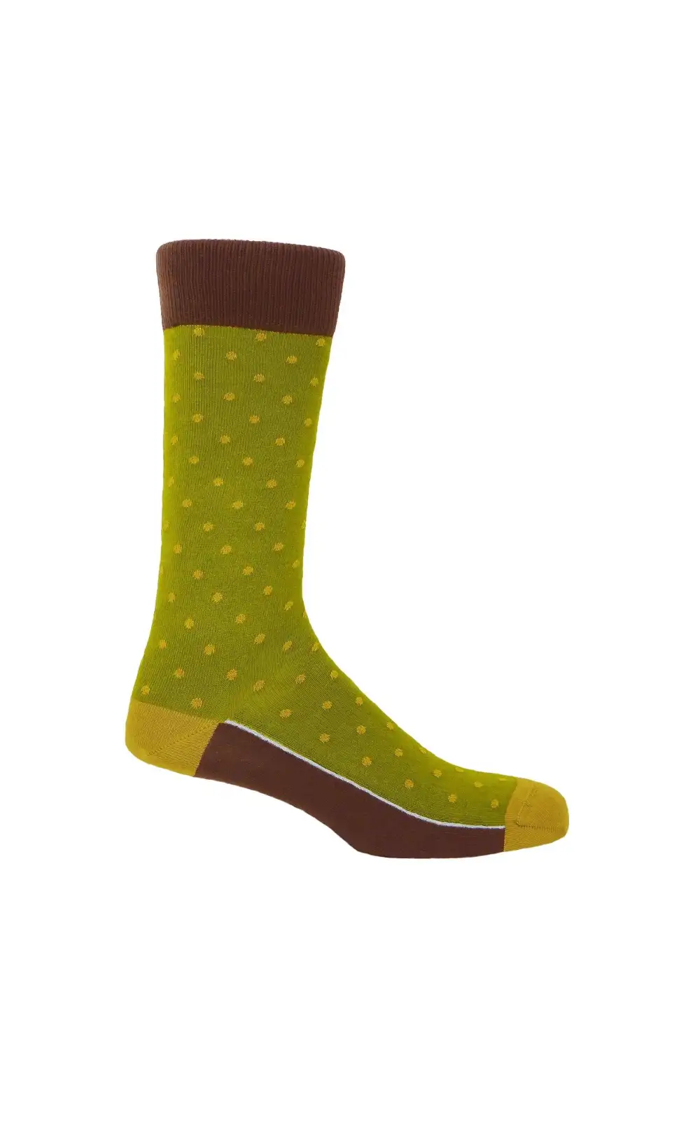 Add a spot of colour with our olive Pin Polka men's luxury socks. With its lively dots and contrasting cuff, heel and toe, the Pin Polka collection is a Peper Harow best seller and a must-have for any sock drawer. A perfect complement to everyday attire.