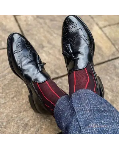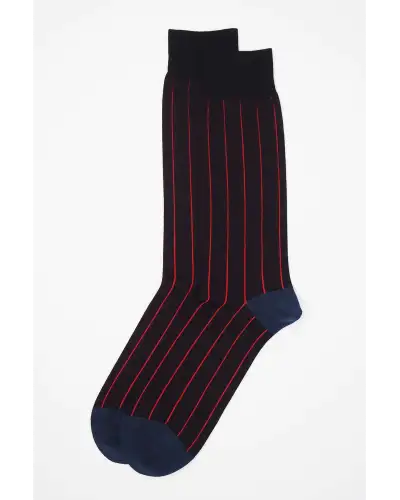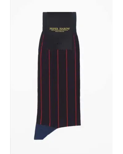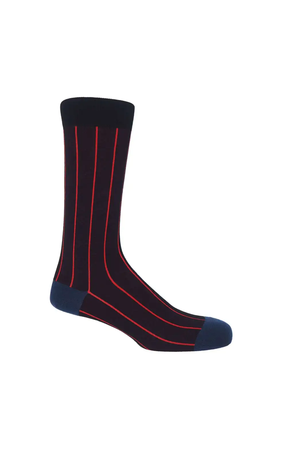 A timeless classic, the black Pin Stripe. These luxury striped socks for men are a perfect and extremely comfortable addition to all gentleman's sock drawers. With its contrasting red stripes and navy heel and toe, these black socks will complement almost any dapper outfit.