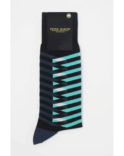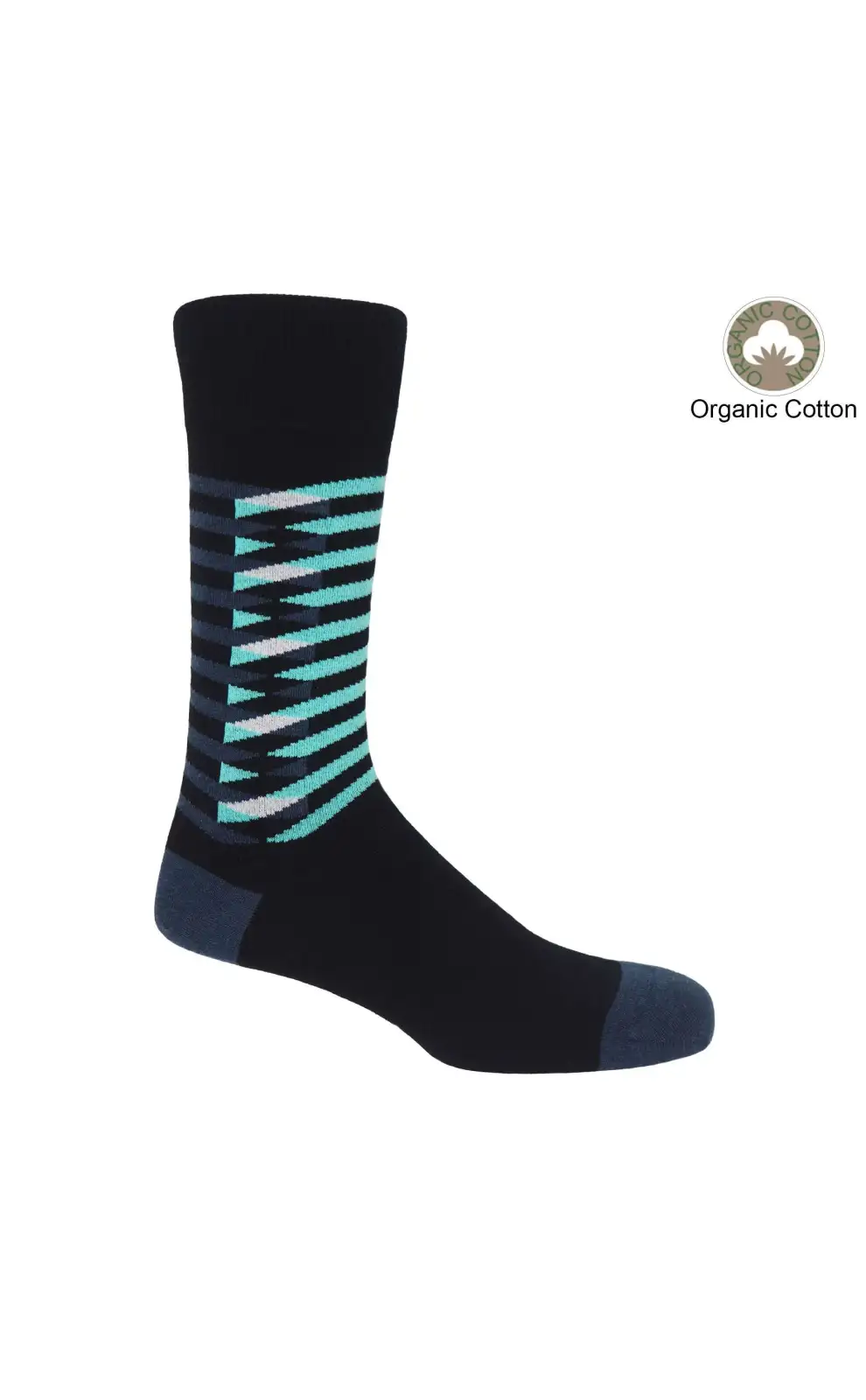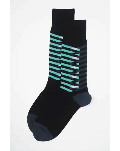 For a balanced sense of style, the alluring Symmetry black men's organic cotton socks are the only way. They feature dazzling aqua blue and deep navy stripes flowing in perfect harmony. The perfect pair of luxury socks for smart or casual occasions.