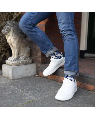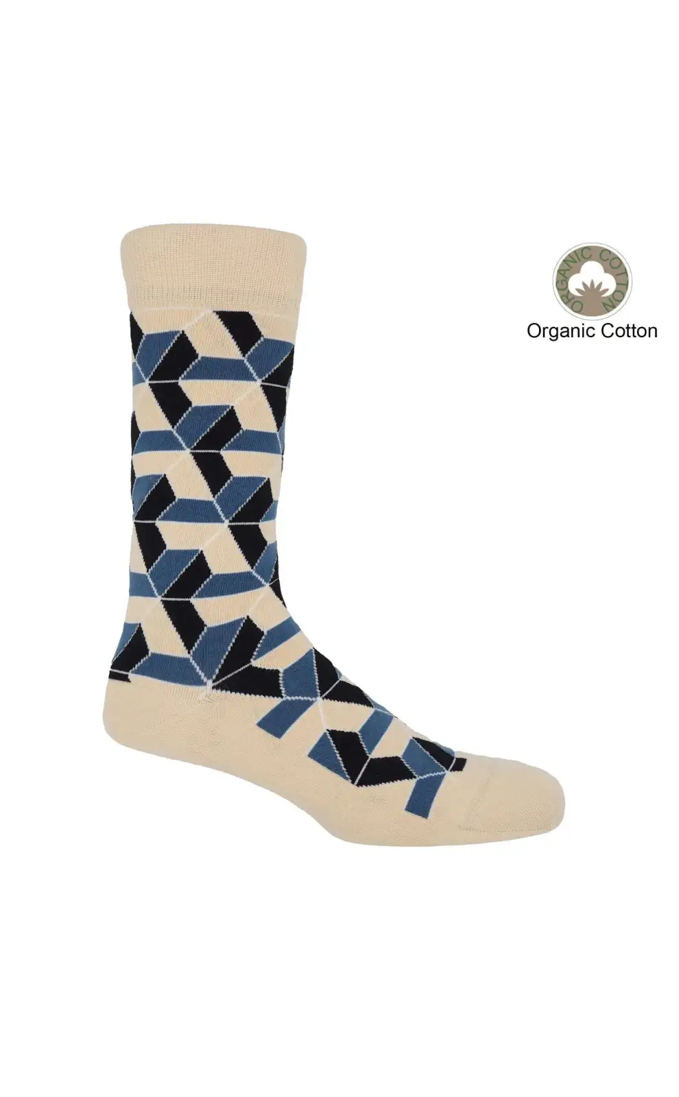 The Vertex men's luxury socks in beige epitomise impeccable style with their modern hexagonal design of blue, beige, and black, lending a tastefully trend-savvy aura to any outfit. Slip into luxury and exclusivity with these exquisite socks for men.
