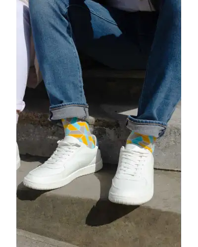 The Vertex men's yellow luxury socks offer a fashionable, hexagonal design of yellow, beige and blue, adding tasteful style to your attire. Experience luxury and exclusivity with these impeccable men's socks.