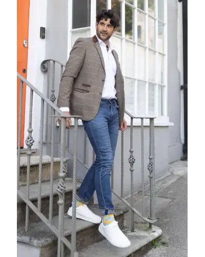 The Vertex men's yellow luxury socks offer a fashionable, hexagonal design of yellow, beige and blue, adding tasteful style to your attire. Experience luxury and exclusivity with these impeccable men's socks.
