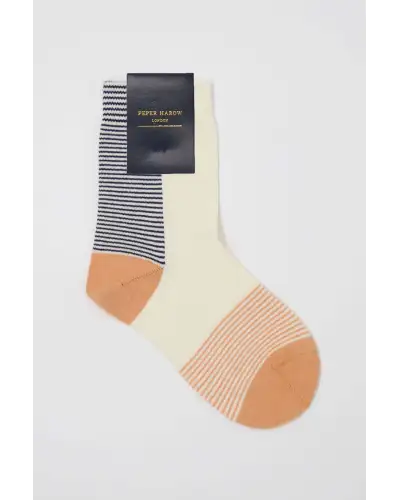 Introducing the warm honey Anne socks for women, colour-ways in partnership with The English Soap Company. These sumptuous ladies socks epitomise comfort and luxury, with their contrasting heel and toe and navy stripes. The perfect socks to match any outfit combination, while still maintaining style.