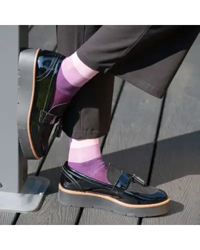 Whether you're looking to explore a new style or just want a pair of bold statement socks, the twilight Block Stripe women's luxury socks are ideal. These women's socks feature bold stripes in a variety of purple hues, and are a unique addition to every lady's outfit, no matter the season.