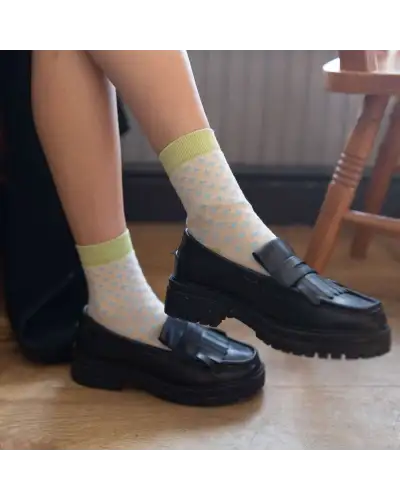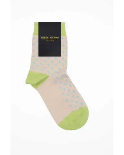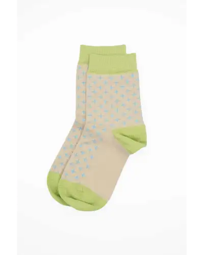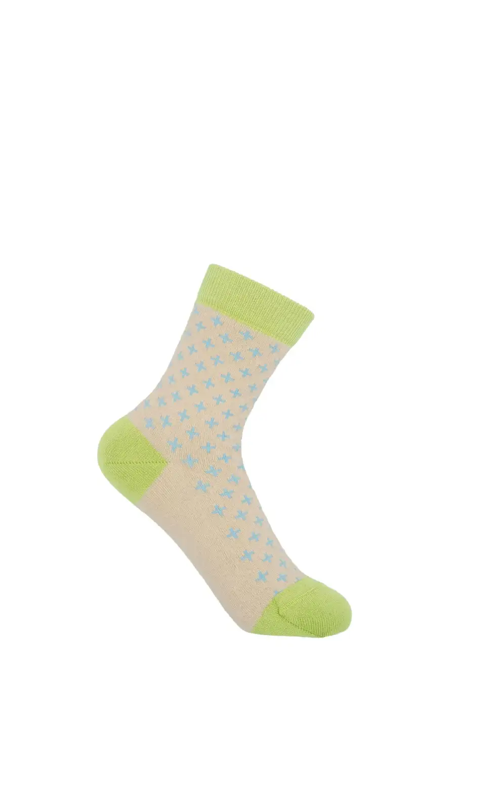 The beige Crosslet women's luxury socks are a perfect piece to add to your wardrobe! These luxury women's socks feature an eye-catching combo of beige with light blue crosses with an extra splash of lime at the heel, toe, and cuff. You'll be looking and feeling stylish, in any outfit, in no time.