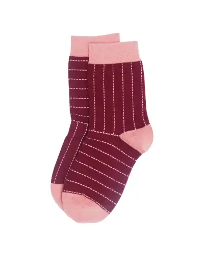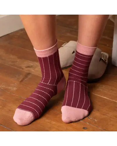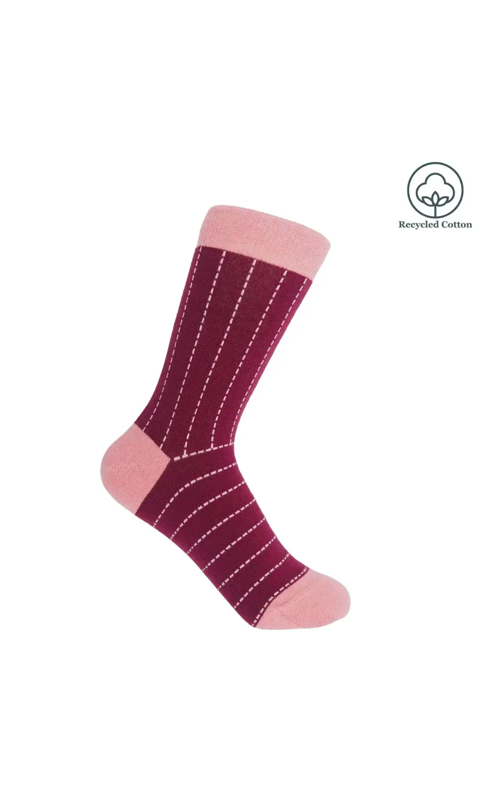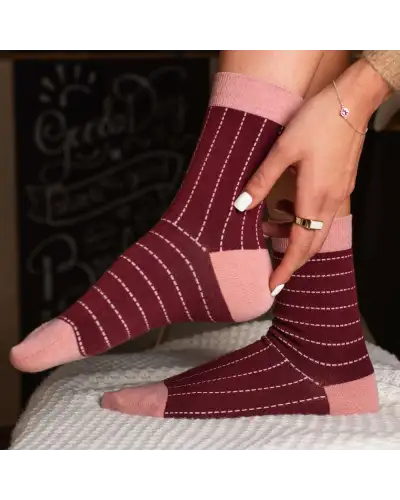 The maroon Dash women's socks feature a unique pattern that is sure to catch the eye and are a true fashion statement for ladies. Featuring a vertical and horizontal dash pattern on one sock and the opposite on the other, these women's maroon socks are perfect for any occasion.