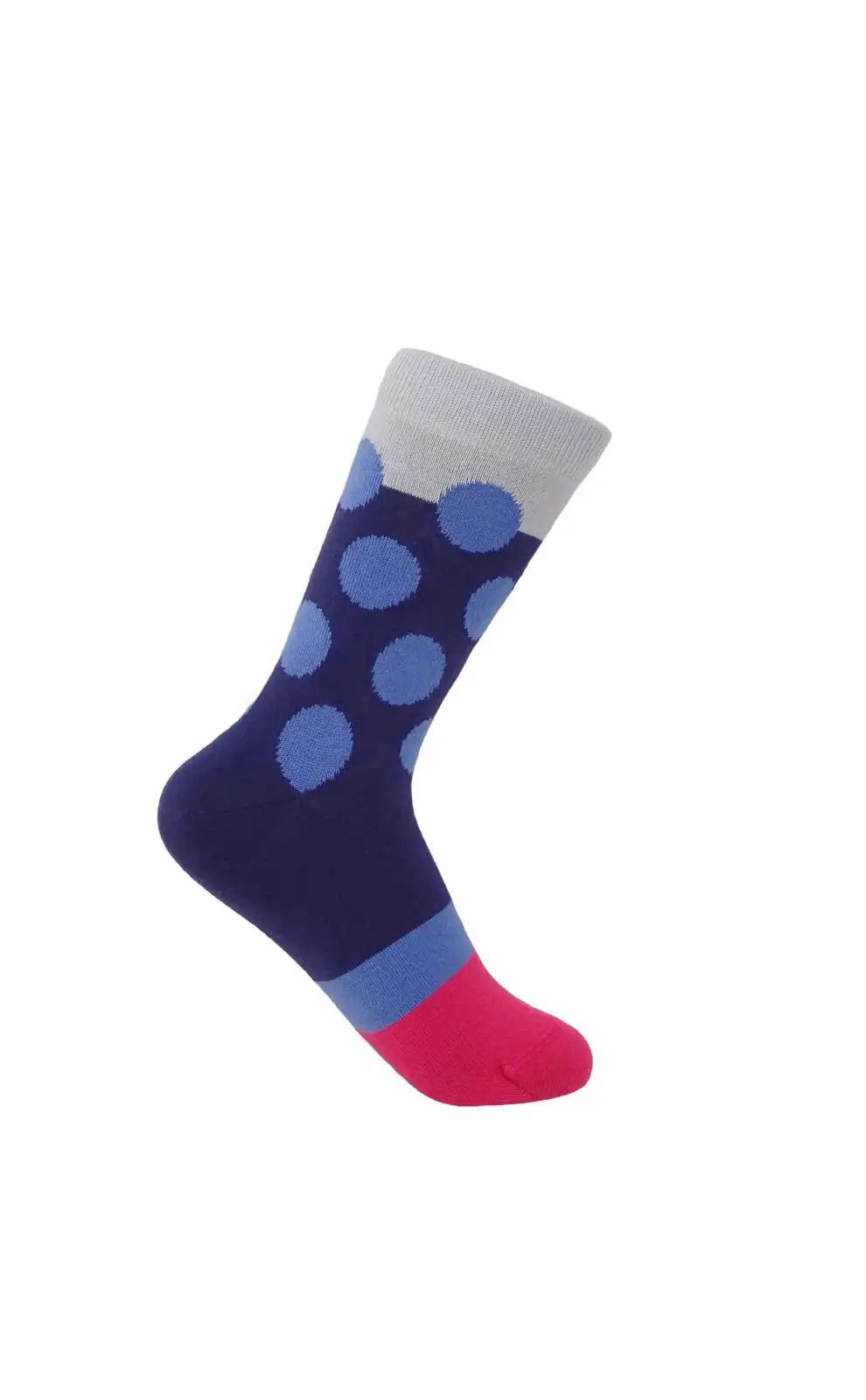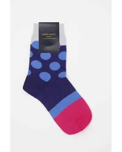 Introducing the stunning navy Eleanor socks for women. These charming, polka dot socks are a cosy addition to any ladies sock drawer, featuring contrasting blue polka dots and a vivid pink toe. Luxurious socks for her, for any occasion.