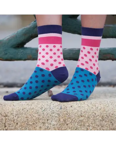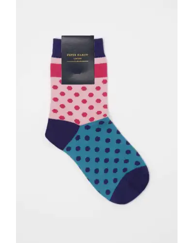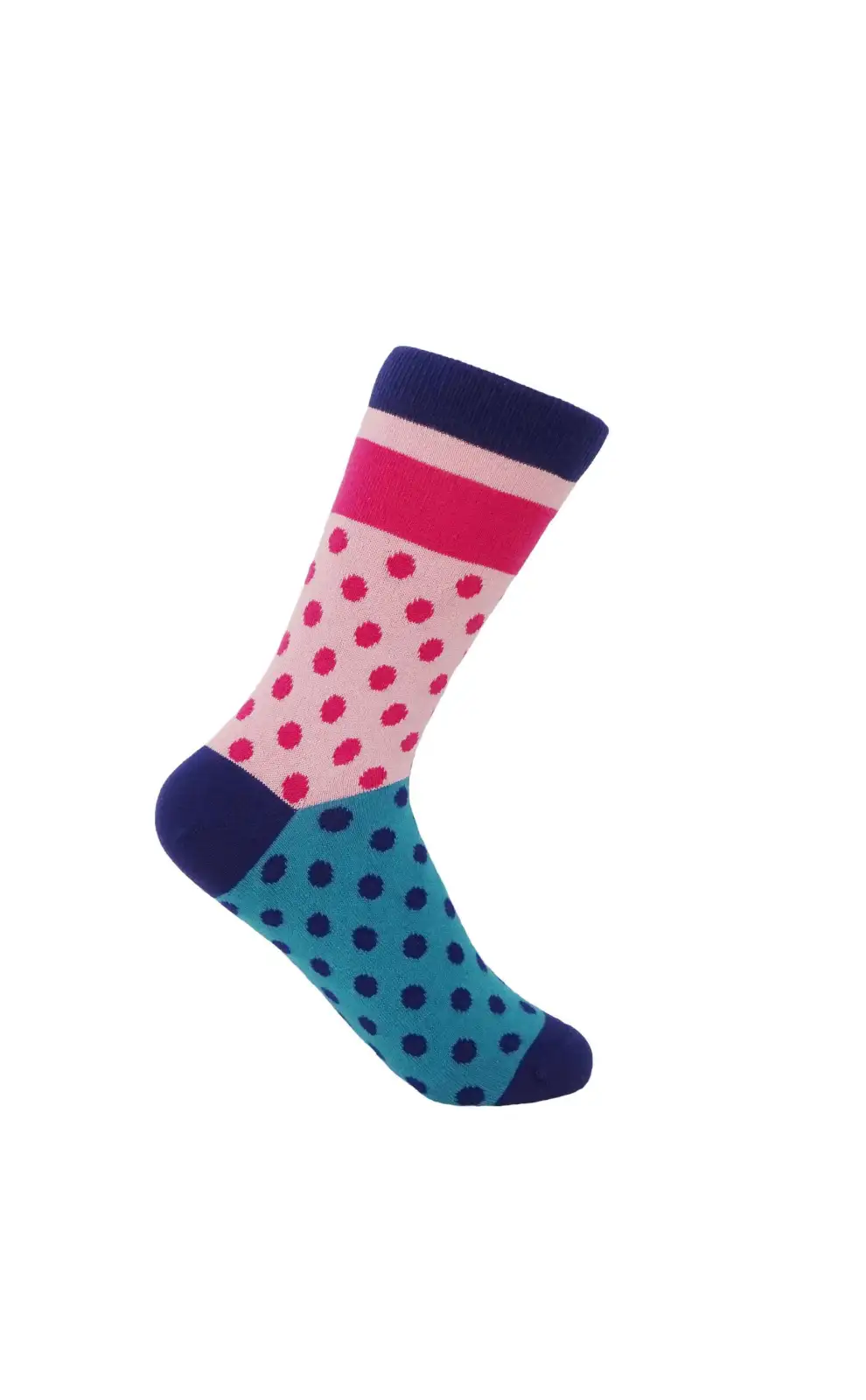 Introducing the gorgeous bubblegum Kathrine socks for women. These rich, colourful, socks are a stunning addition to her outfit, featuring vivid Pink polka dots on one half, and dark Blue polka dots on the other. Contrasting perfectly with the peacock and blush, these colourful women's socks are an absolute must-have for the stylish women out there who love luxury, comfort and bright designs.