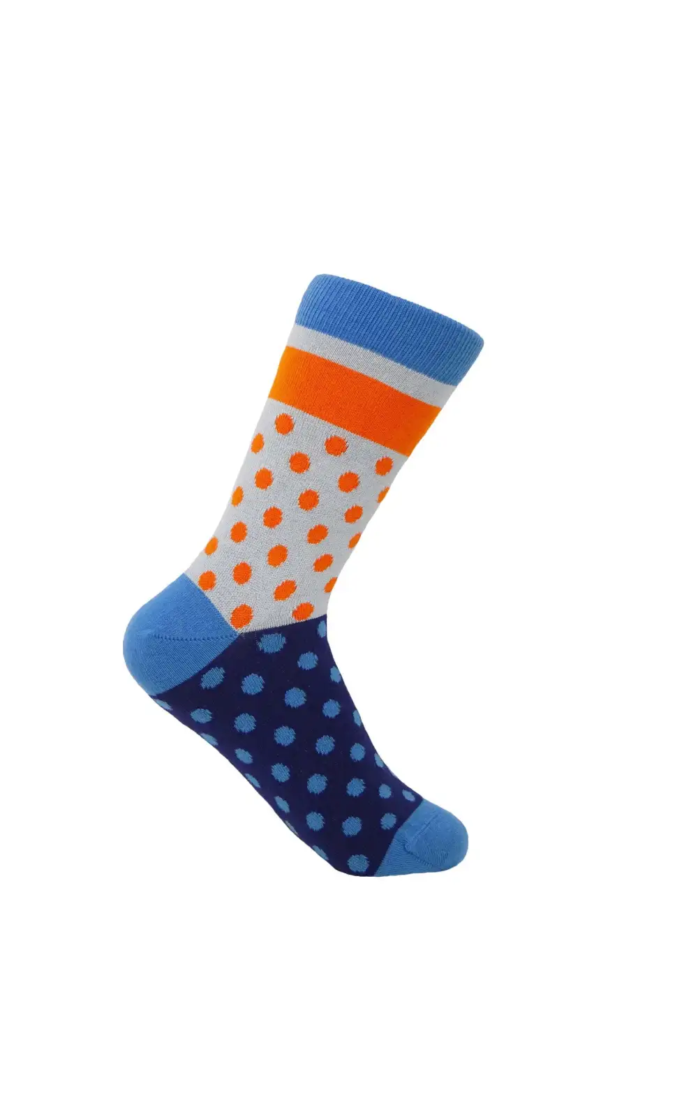 Introducing the gorgeous navy Katherine socks for women. These rich, colourful, socks are a stunning addition to her outfit, featuring vivid orange polka dots on one half, and bright blue polka dots on the other. Contrasting perfectly with the grey and navy, these colourful women's socks are an absolute must-have for the stylish women out there who love the comfort and bright designs.