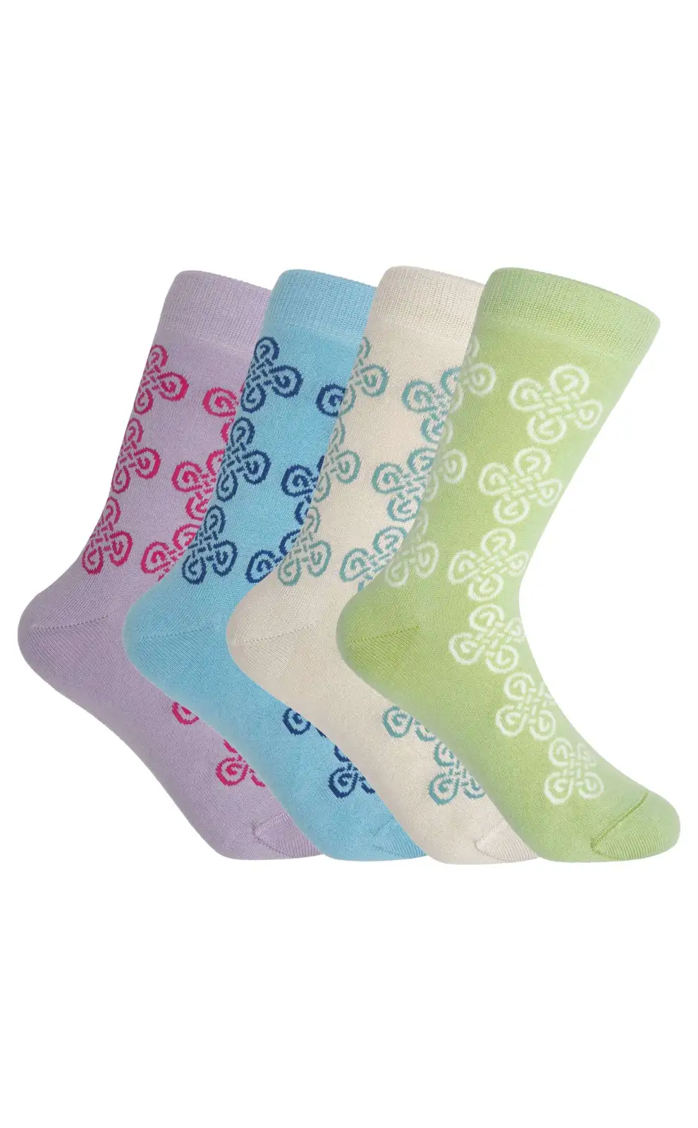 The Heritage women's Knot bundle brings together the contemporary Knot design in four stylish colours including lilac, blue, cream, and lime. Featuring a unique Celtic knot pattern in complementary hues. These luxury women's socks balance sophistication and versatility, making them ideal for any occasion. A true blend of heritage and modern fashion, they're a must-have for any wardrobe.