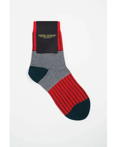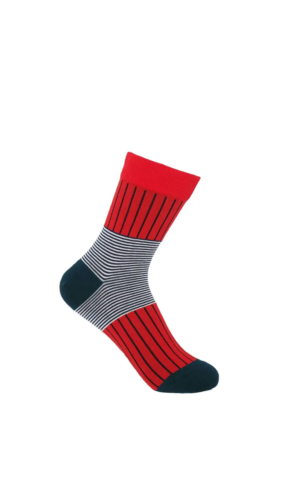 Introducing the scarlet Oxford Stripe for ladies. These sumptuous striped women's luxury socks, a best-seller, are the embodiment of quirky style with their horizontal and vertical stripes. Made from Egyptian cotton, these luxury red socks are the perfect addition to your outfit.