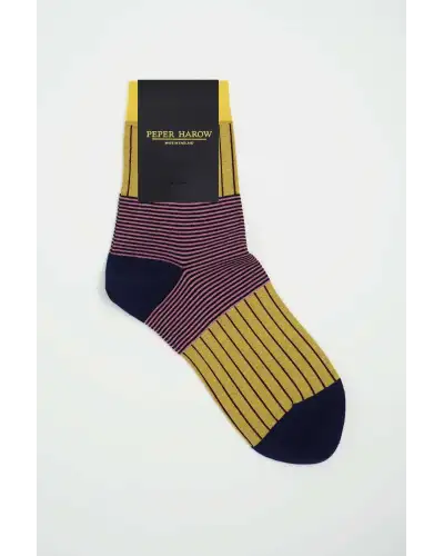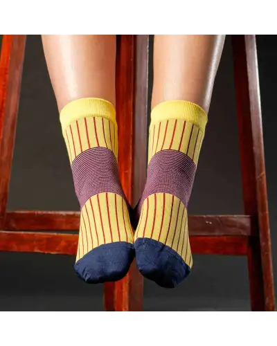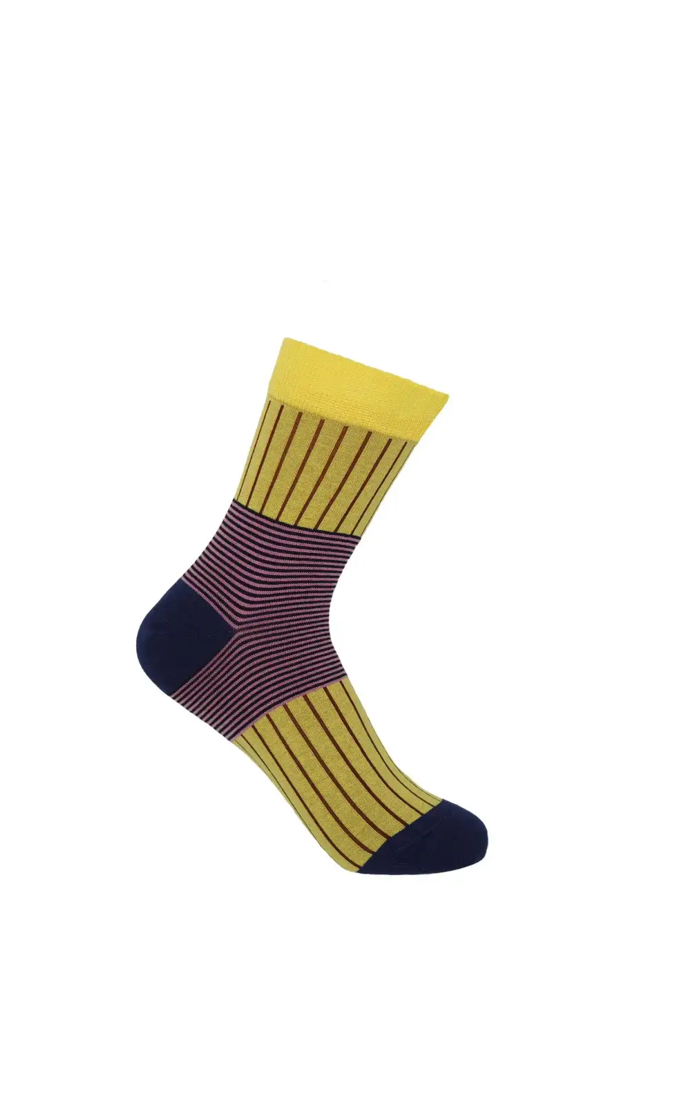 Introducing the yellow Oxford Stripe for ladies. These sumptuous striped women's luxury socks, a best-seller, are the embodiment of quirky style with their horizontal and vertical stripes. Made from Egyptian cotton, these luxury yellow socks are the perfect addition to your outfit.