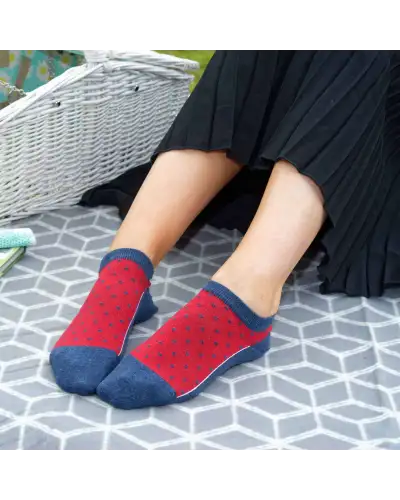 A timeless design made even more sustainable. The denim Polka women's organic trainer socks are a soft, stylish addition to your summer outfit. With their cherry red and denim polka dot design, these luxury women's socks offer impeccably made comfort and style.