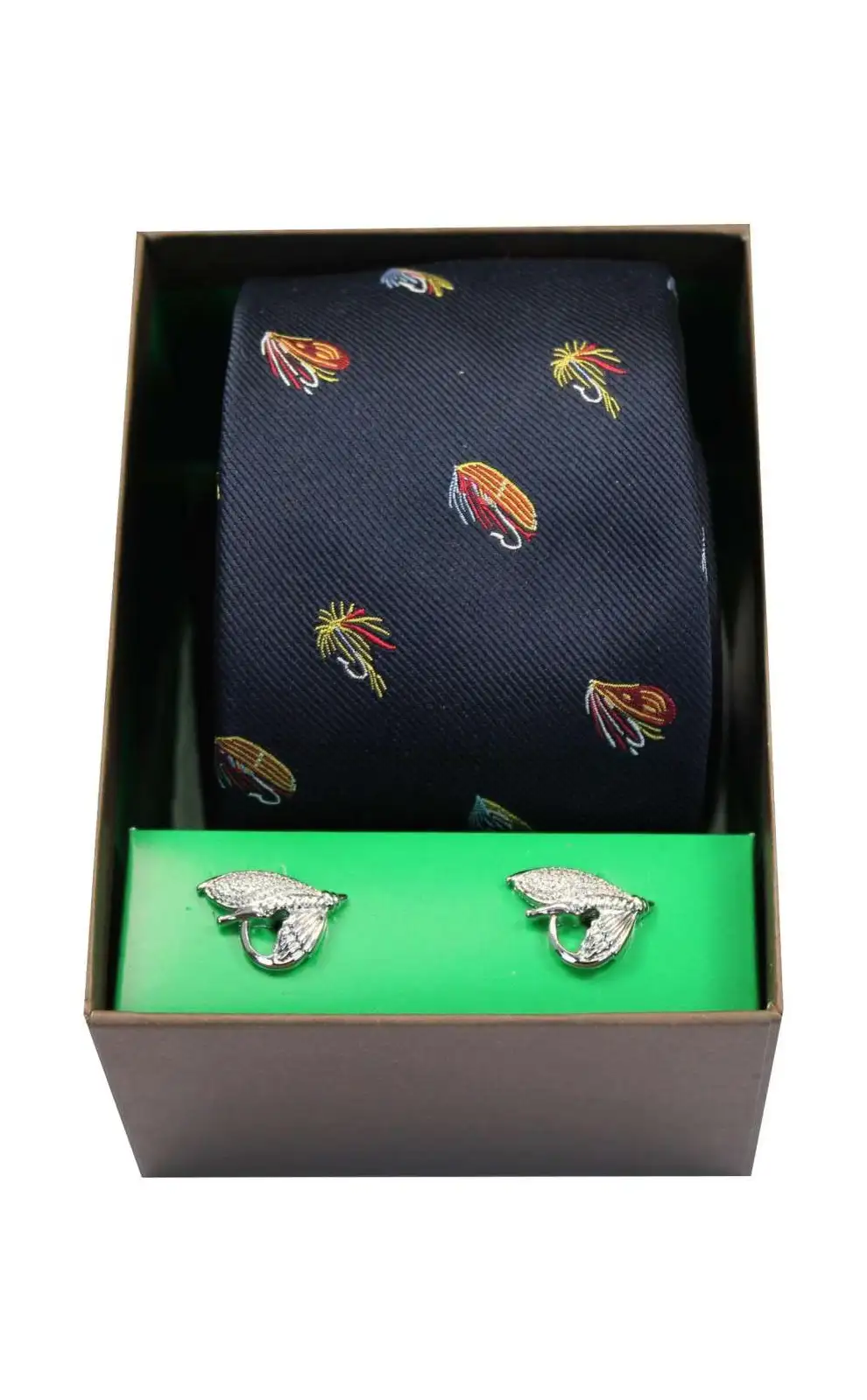 - Fishing Flies On Navy Ground Tie And Cufflink Set In A lovely Box With Lid