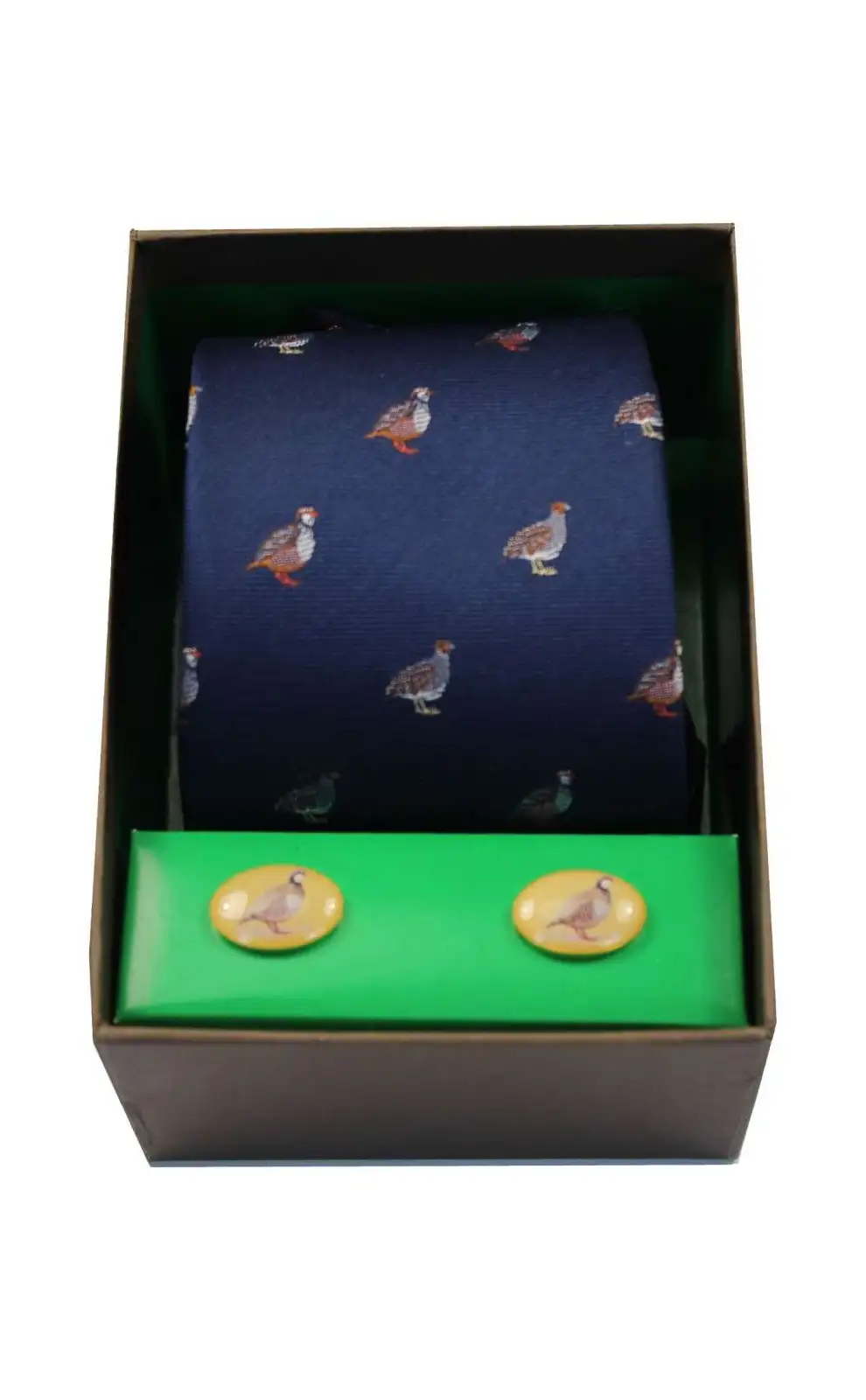 - Grouse On Navy Ground Tie And Cufflink Set In A lovely Gift Box With Lid