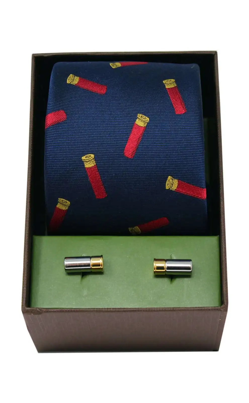 - Gun Cartridges On Navy Ground Silk Tie And Cufflink Set In A lovely Gift Box With Lid