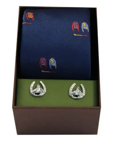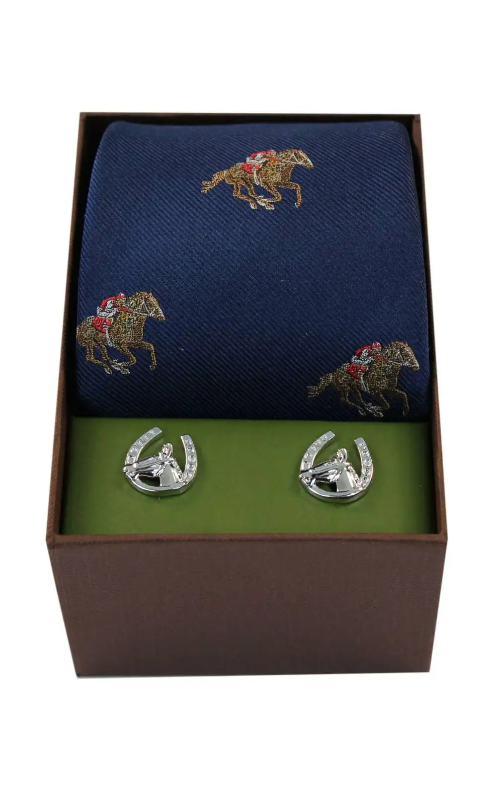 - Horse Racing Themed Tie And Cufflink Set In a Lovely Gift Box Lid
