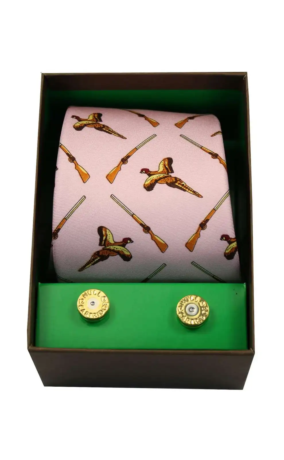 Pink Flying Pheasants and Shotguns Tie and Cufflink Set