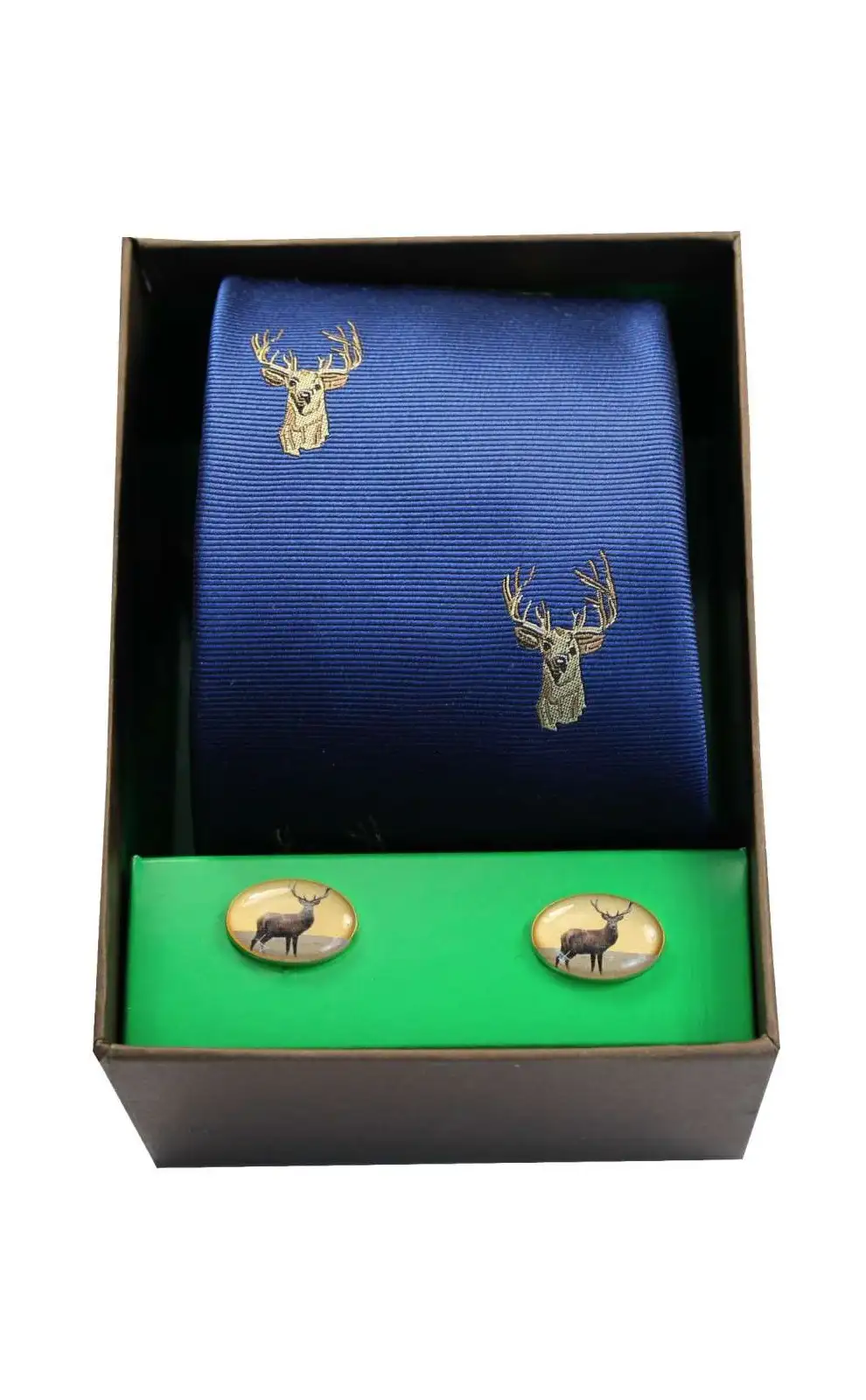 - Stags Head On Royal Blue Ground Tie Cufflink Set In A lovely Gift Box With Lid